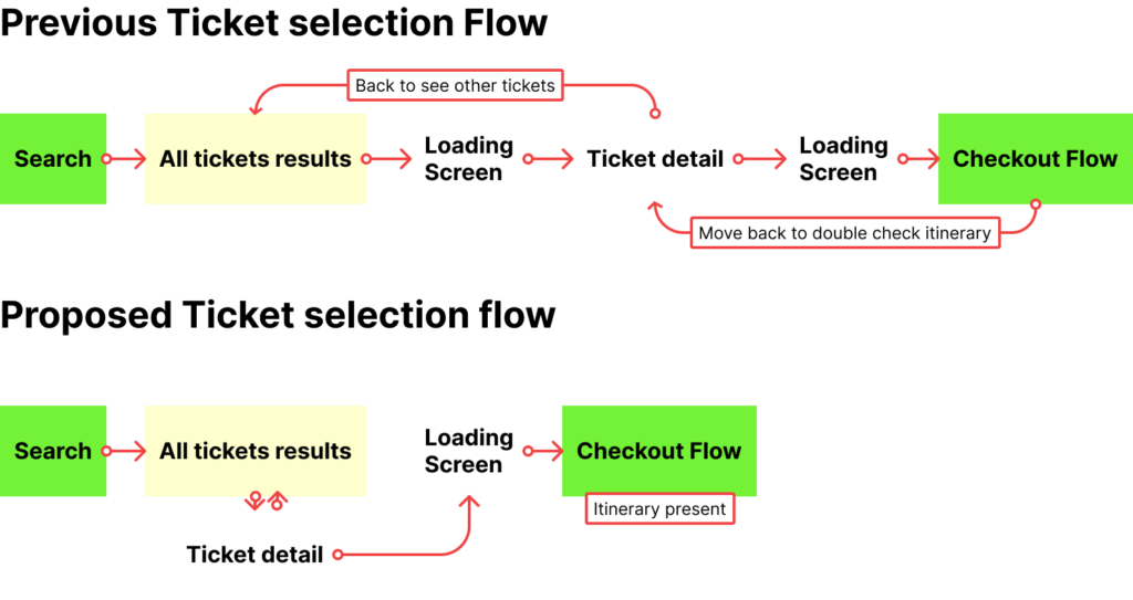 Solution: I worked with developers to explore the possibility of retrieving all ticket details during the initial load. Although we discovered this would negatively impact loading times, we made a smaller adjustment that removed one loading screen, improving the overall user experience.