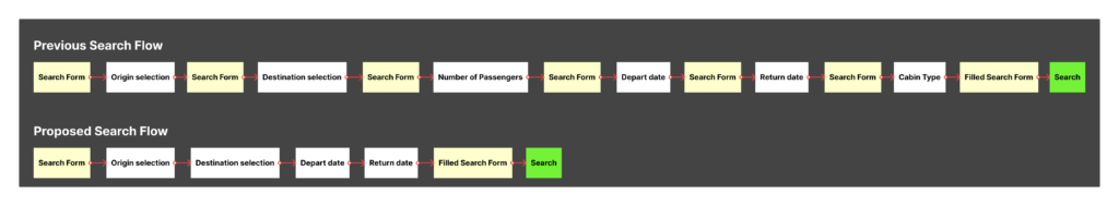 Another proposal, not implemented, was to trigger the API call when the form was completed before users clicked “search.” Since 95% of users searched for one passenger in economy class, we already had enough information to pre-load results. However, this idea was rejected due to additional costs.